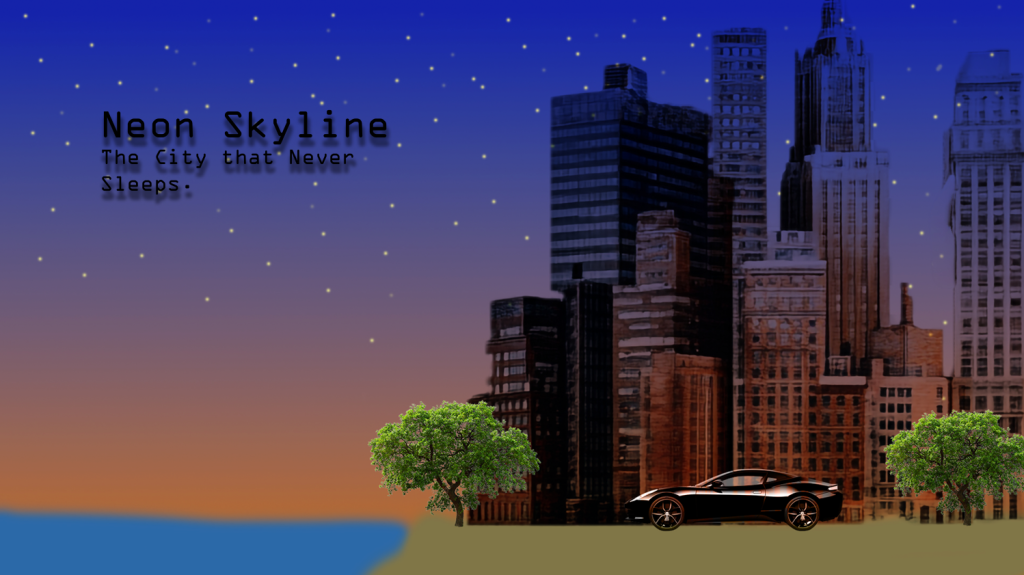 As you can see, we have unique details with the stars, and the ocean and sand using the brush. We have buildings brought in from different PNGs and cut out using the lasso and magic wand. We have more than 5 layers. 7 Layers in total. With the buildings have a lot of blend to adjust the background and night feel. We have a gradient for the sunrise along with the name “Neon Skyline” for my cityscape.